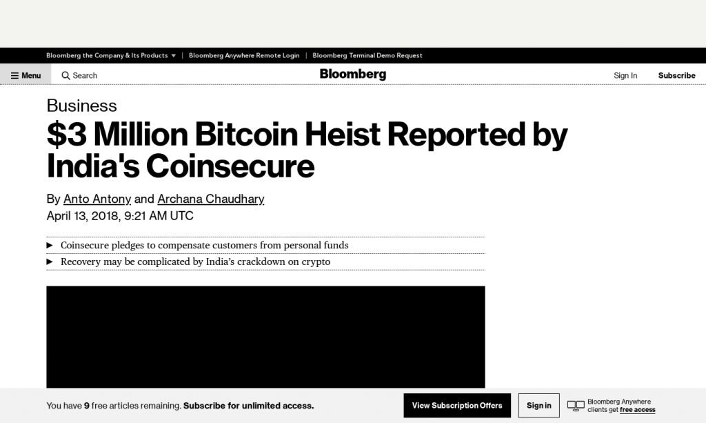 $3 Million Bitcoin Heist Reported by India’s Coinsecure ( 13 April 2018, Bloomberg )